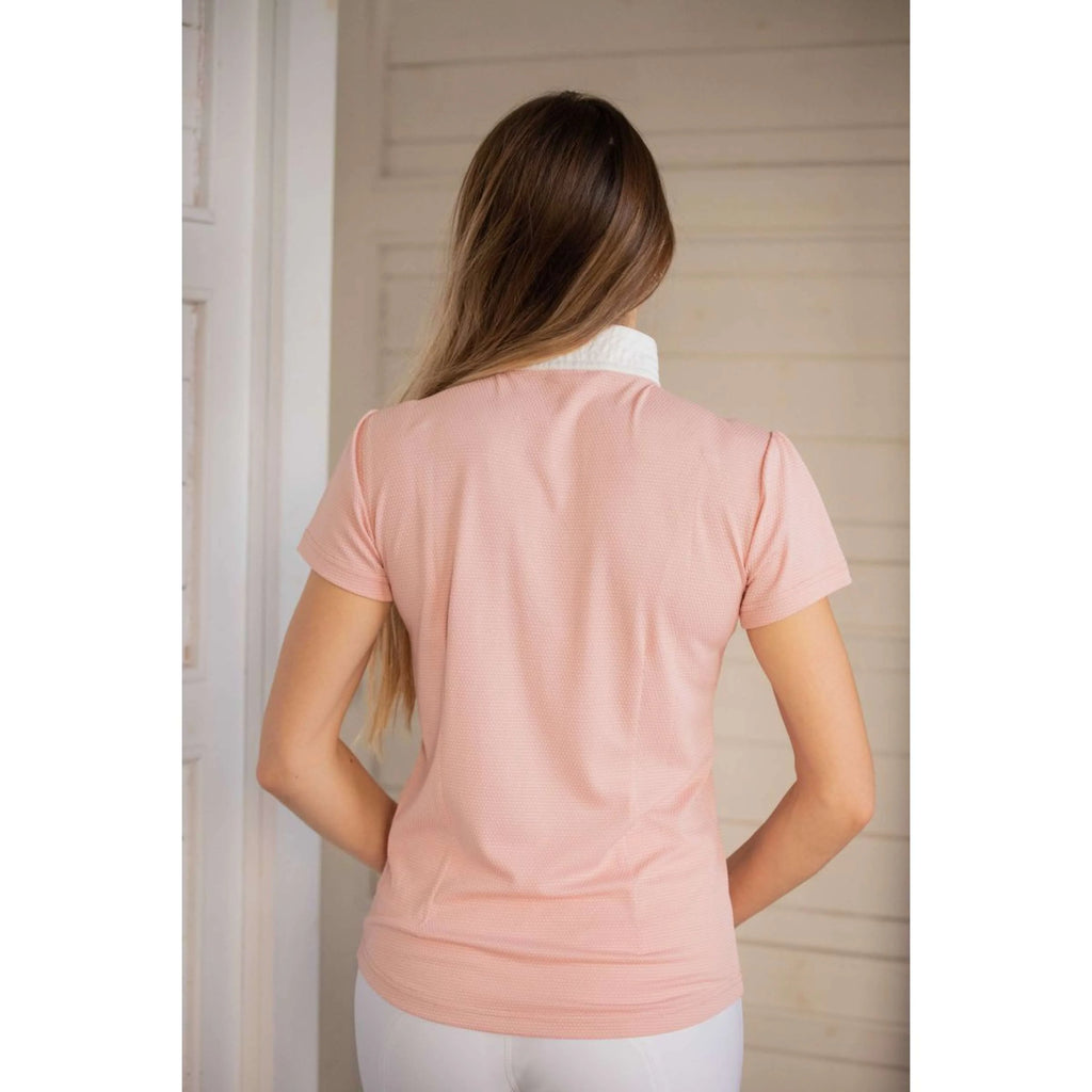 Wedstrijdpolo Las Honey met korte mouwen, gemaakt van een lichtgewicht en ademende honingraatstof. Met zijn ontworpen plastron combineert hij elegantie met de technische vereisten voor ruiterwedstrijden.