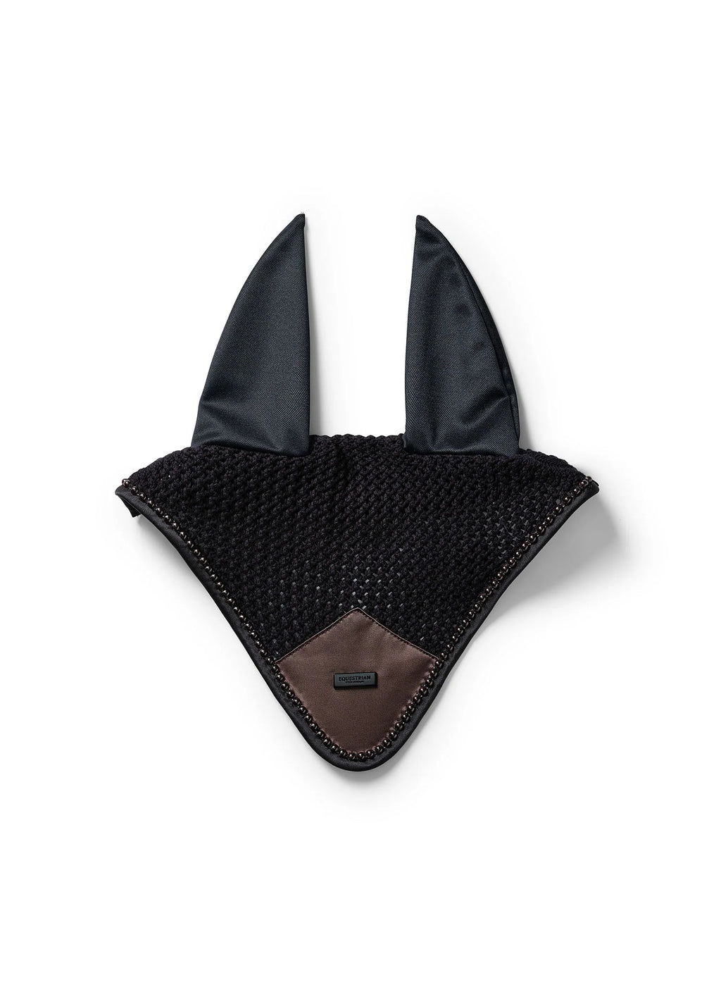 Luxe gehaakte oormuts in stijlvolle kleuren. Versierd met een satijnen patch op de voorkant, bijpassend bij de matching collecties. Het oornet biedt zowel insectenbescherming als ruisonderdrukking. Het heeft elastische doek op de oren voor extra comfort. Past perfect bij de zadeldek uit de Modern Mocha collectie, Amber rosé & Lagoon Blush.