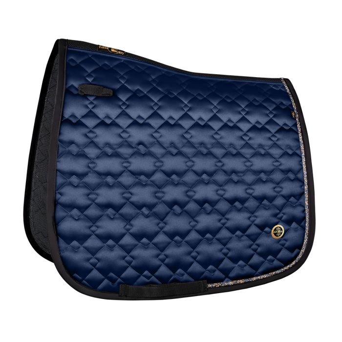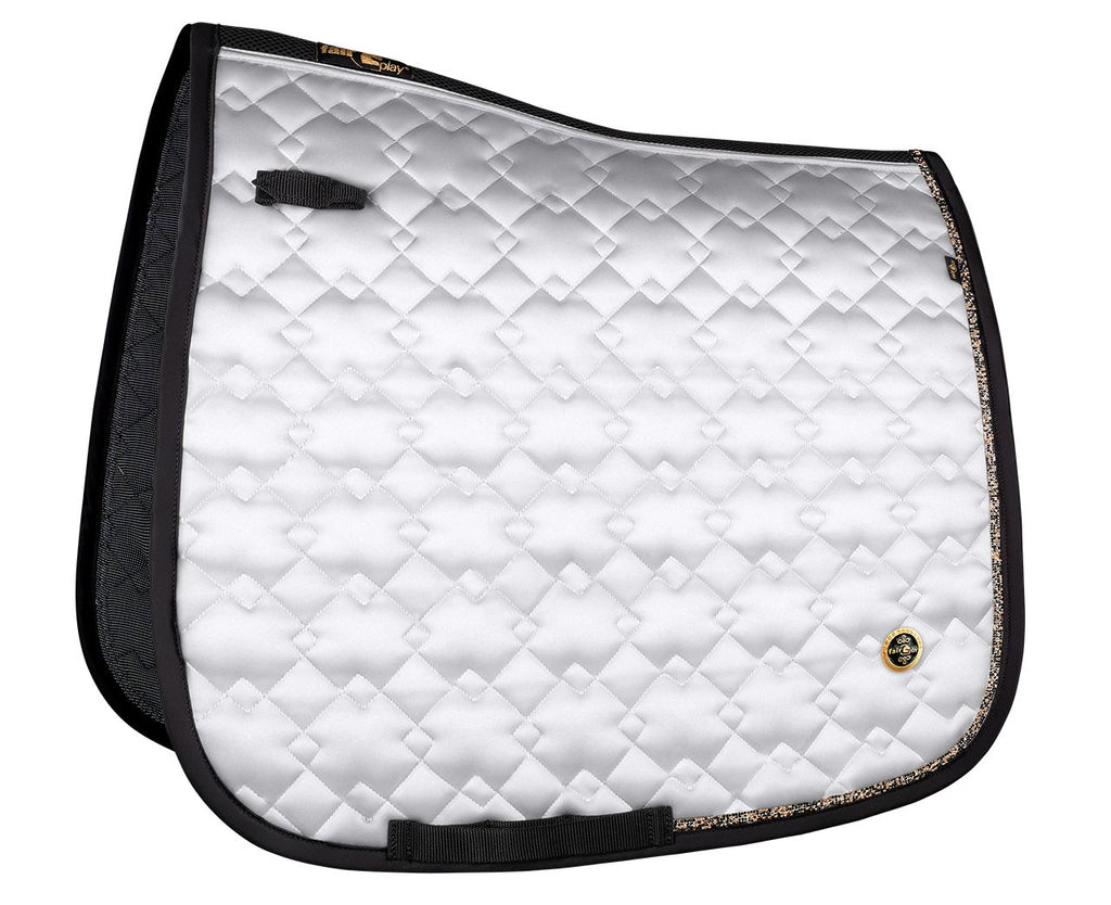 Deze luxe zadeldek is gemaakt van hoogwaardig satijn en heeft een stijlvolle gewatteerde afwerking. Dankzij de geprofileerde, anatomische vorm sluit het perfect aan op de rug van het paard, wat zorgt voor optimaal comfort en een stabiele ligging. Het zadeldek is verfijnd afgewerkt met een subtiel sierkoord versierd met steentjes. De ruglijn is vervaardigd van 3D air mesh, wat de luchtcirculatie bevordert en oververhitting voorkomt. Aan de binnenkant is het gevoerd met zacht polyester en bevat het speciale CERAMIC-tech™-draad, dat bijdraagt aan een betere doorbloeding en spierontspanning. In de dressuurversie zijn er D-ring bevestigingen aanwezig. Het geheel wordt gecompleteerd door een stijlvol Fair Play-logo.
