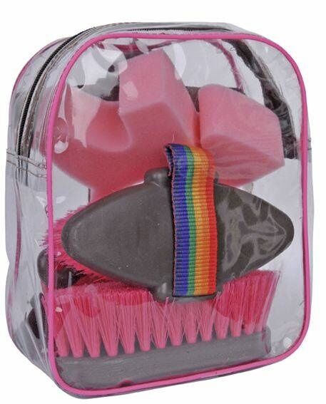 Rugtasje met poetsset, bestaand uit rosborstel, harde borstel, glansborstel, spons en hoevenkrabber.