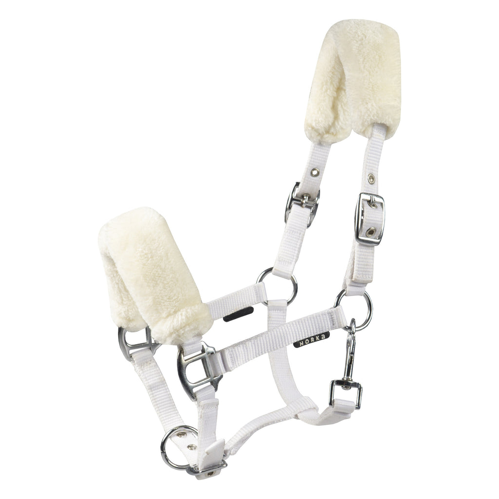 | Luxe veulen halster met imitatie bont. Productspecificaties: - Neusband verstelbaar - Kopstuk verstelbaar aan beide zijdes - Kopstuk en neusband bedekt met imitatie bont Materiaal:Polypropeleen (PP) bedekt met polyester imitatie bont, vernikkeld ijzerwaar |