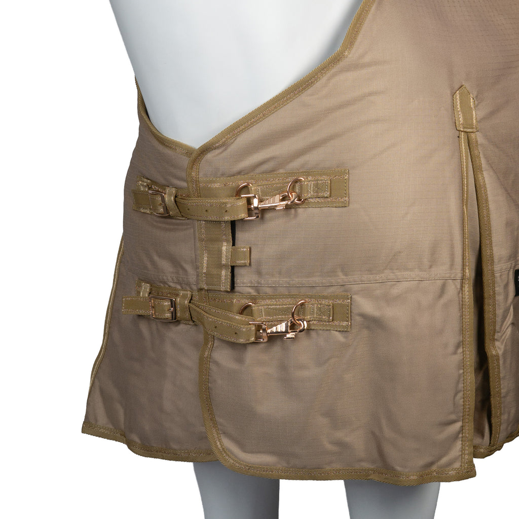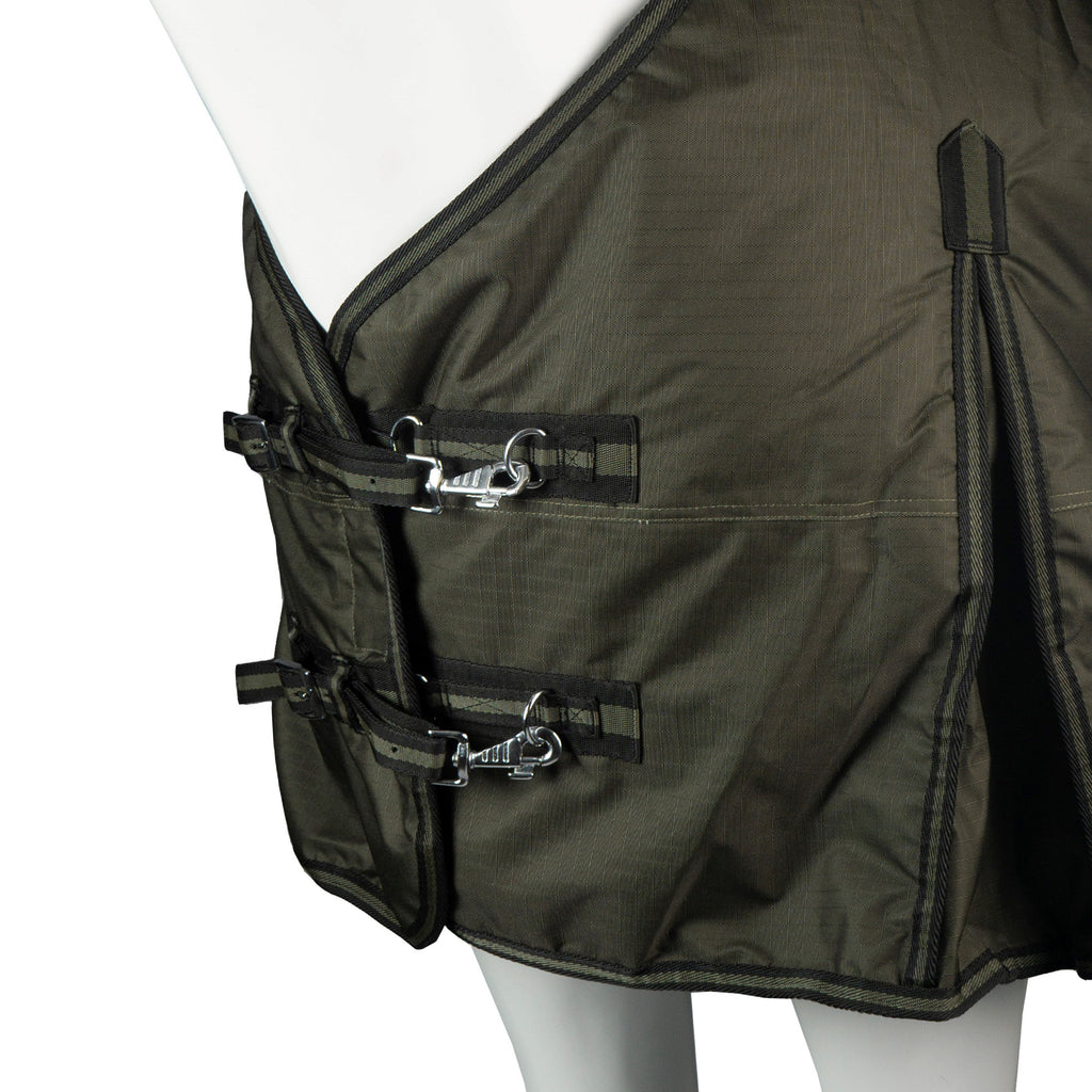 | Deze outdoor deken Dime is te combineren met een losse hals (180337). De deken heeft een 200 grams vulling en een polyester voering. Op de borst zit een dubbele verstelbare sluiting, de kruissingels hebben een elastisch uiteinde en rubber stops. De schoft is bont gevoerd en hier zitten ringen, waaraan de hals door middel van klittenband kan worden bevestigd. Productspecificaties: - 600D rip stop - 3000 mm waterdicht en 3000 mvp ademend - 200 grams vulling en polyester voering - Dubbele verstelbare sluiting op de borst met clips en gespen - Kruissingels met elastisch uiteinde en rubber stops - Afneembare bilkoorden - Ruime staartflap - Hoge en wijde loopsplitten - De schoft is bont gevoerd met ringen om de hals aan te bevestigen - Te combineren met losse hals Dime |
