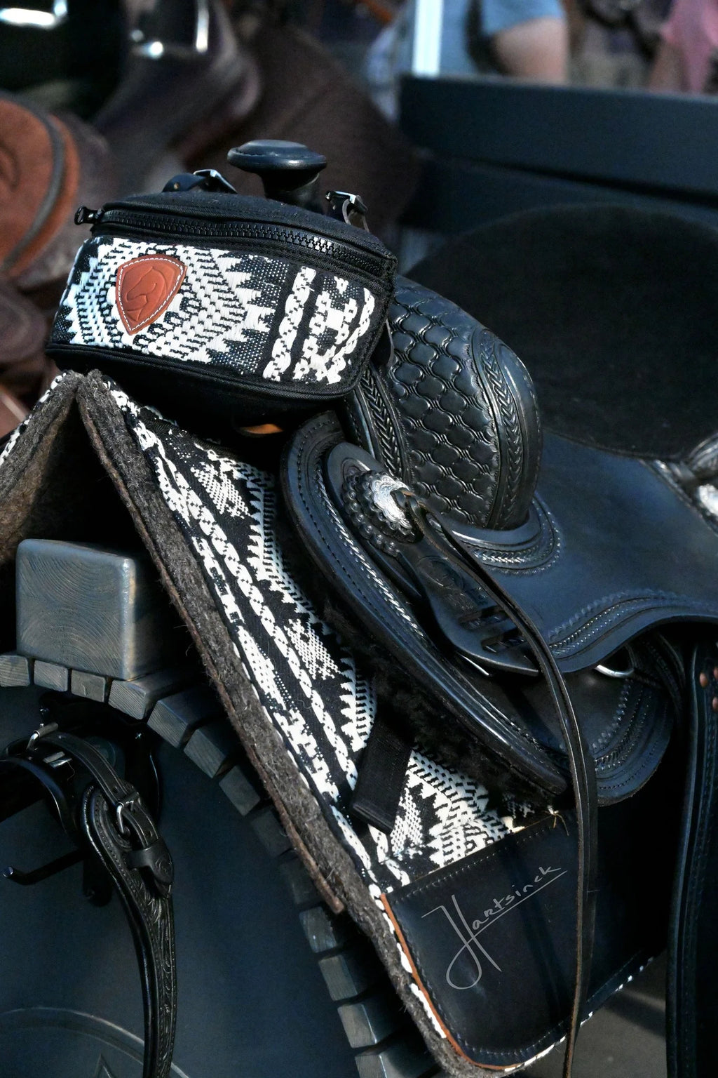Aan de pommel tas zitten twee relatief lange lederen riempjes met gespen. Deze riempjes haal je onder je pommel of fork door. Hierna stel je ze af op de gewenste lengte en klik je de gesp dicht. Mocht je heel veel nylon riempje overhouden zou je kunnen overwegen deze af te knippen en het nylon met een aansteker dicht te branden om rafelen te voorkomen.