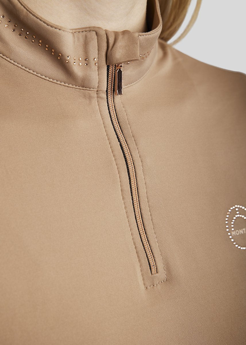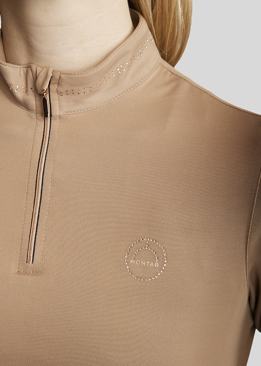 Dit strakke en stijlvolle trainingsshirt is ontworpen met roségouden kristallen in de kraag, wat een vleugje sprankeling toevoegt aan je rijgarderobe. Het Montar-logo op de borst zorgt voor een klassieke afwerking en past naadloos bij het verfijnde ontwerp van het shirt. Perfect voor trainingssessies of casual ritten, de MOEverline biedt een comfortabele pasvorm en een verfijnde look, waardoor je je zelfverzekerd voelt, zowel in als uit het zadel