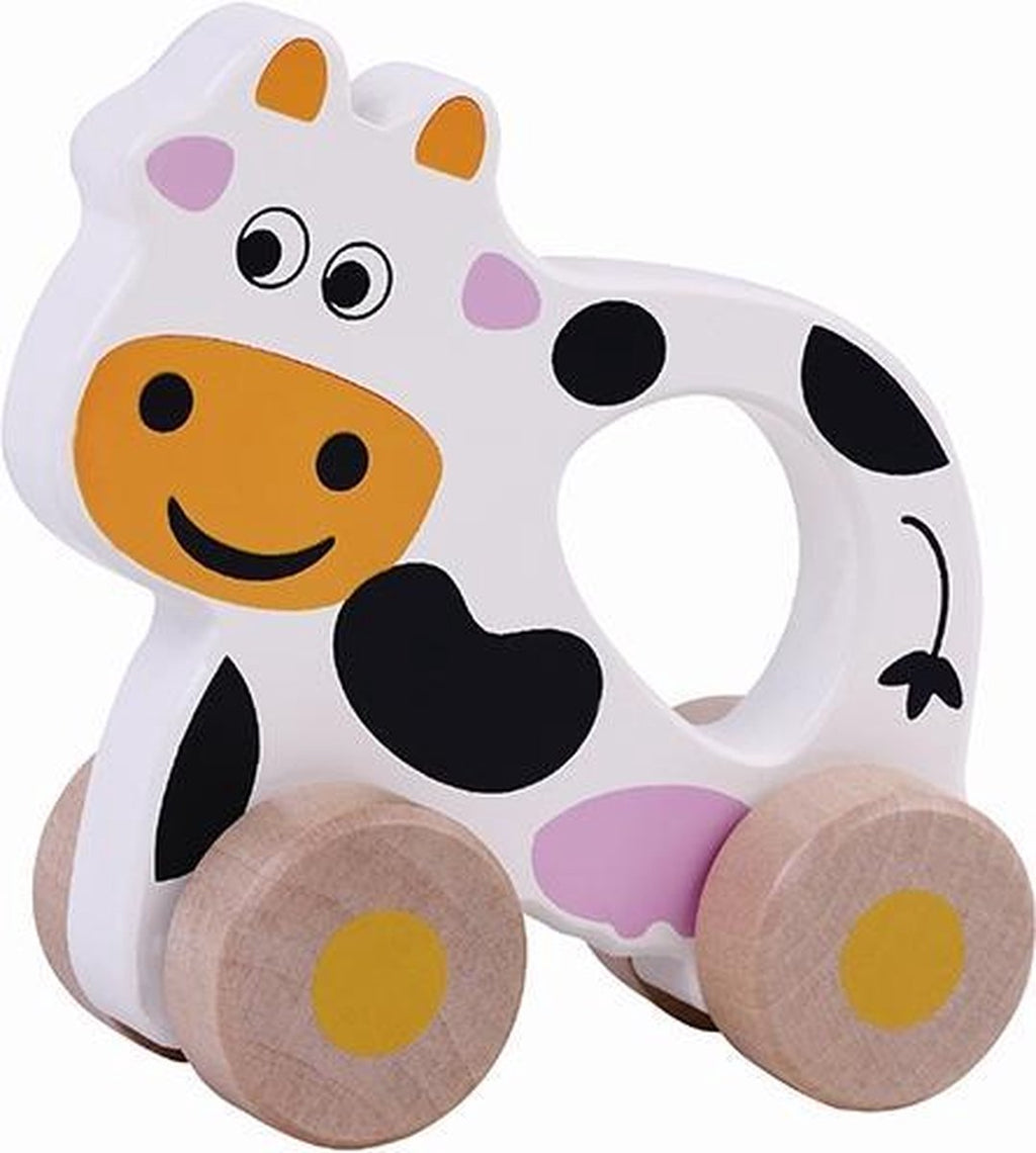 Een houten koe op wielen met handige openingen om de rollende koe vast te houden.Een mooi solide stuk speelgoed voor uw kind.