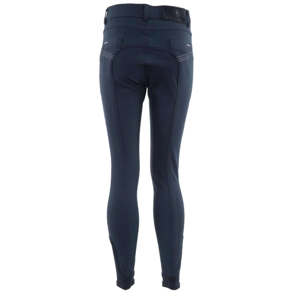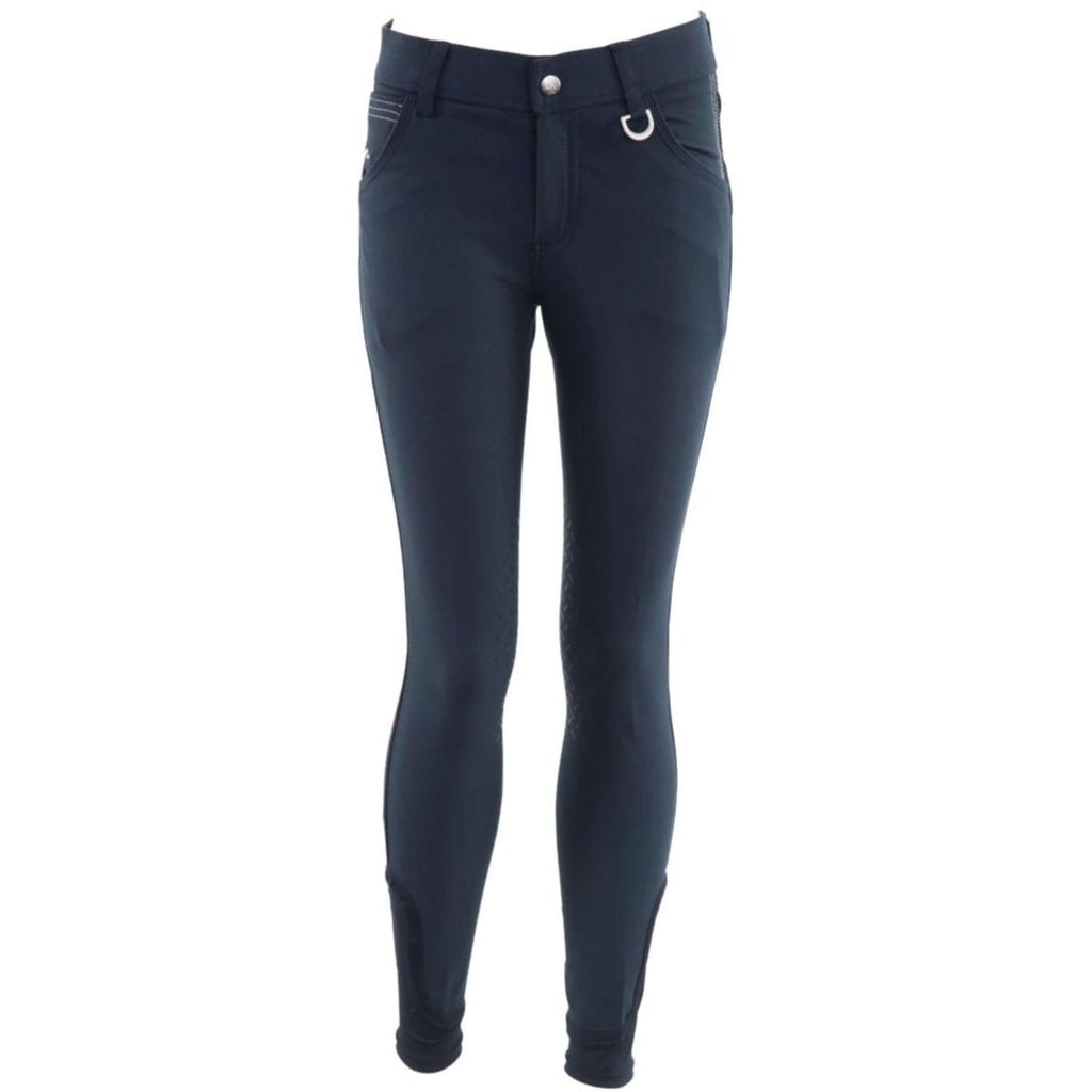 Strak model kinderrijbroek met een stoffen zitvlak en siliconenprint op het knievlak. De rijbroek is voorzien van twee jeanszakken en het extra muntzakje aan de voorkant is voorzien van imitatie diamanten en zilver sierstiksel. Aan de achterkant heeft de rijbroek twee opgestikte zakken die zijn afgewerkt met glimmende studs en zilver sierstiksel. De tailleband is voorzien van riemlussen. De elastische beensluiting staat garant voor optimaal draagcomfort in de rijlaarzen.