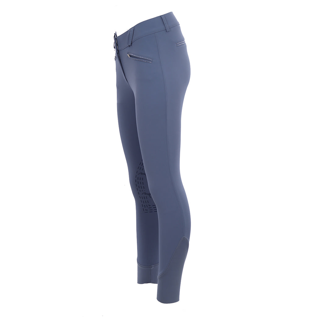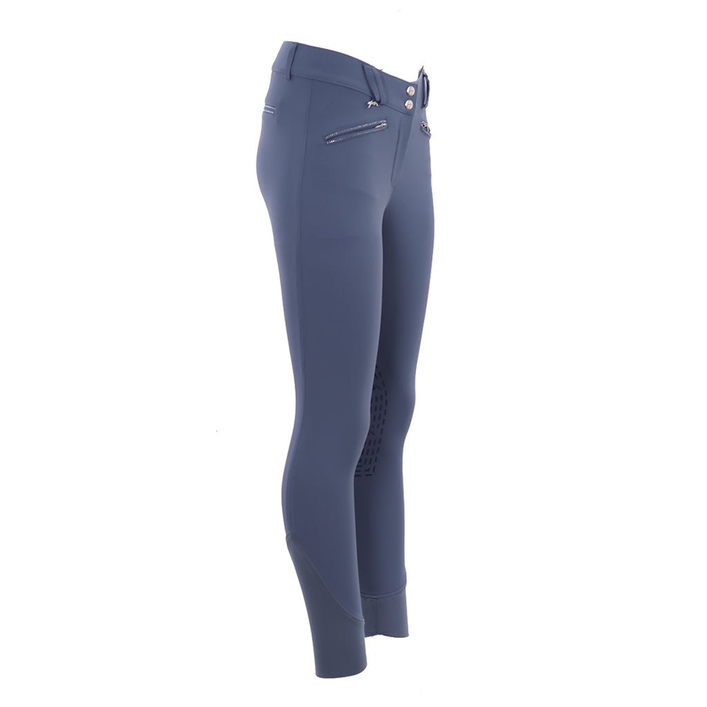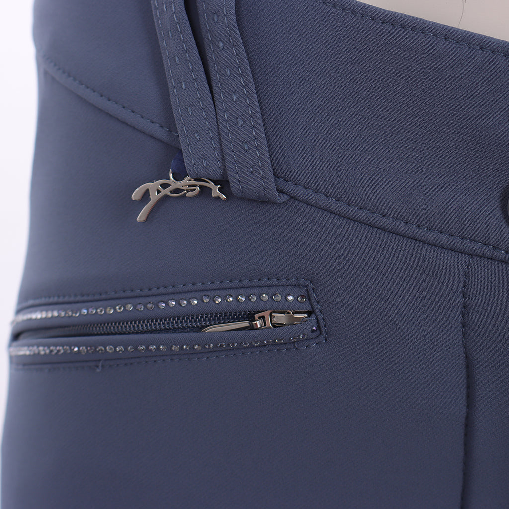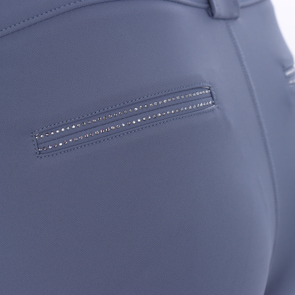 Rocky Rijbroek van Pénélope. Een comfortabele en technische rijbroek voor dagelijks gebruik of voor wedstrijddagen. De nauwsluitende snit en mid-rise taille vormen een perfect silhouet. Hij heeft twee kleine zakken met ritssluiting aan de voorkant en twee nepzakken aan de achterkant, samen met iets brede riemlussen die goed aansluiten op de taille. Hij sluit met twee kleine lipjes aan de voorkant en de riemlussen zijn slank. Aan de binnenkant van de knieën zit een gripzone om het been in het zadel vast te zetten. De broekspijpen zijn gemaakt van lycra om zich aan te passen aan alle lichaamstypes en verschillende beenmaten.